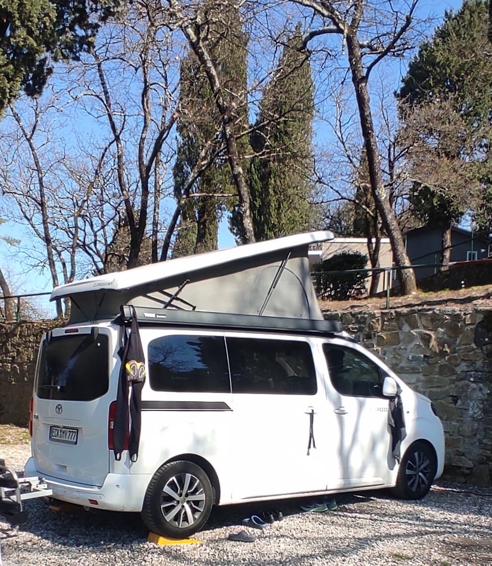 Le nostre piazzole per camper e carrelli tenda sono situate su terrazze, facilmente accessibili e dotate di allaccio elettrico. Alla reception sono disponibili cavi e prese europee in prestito.
